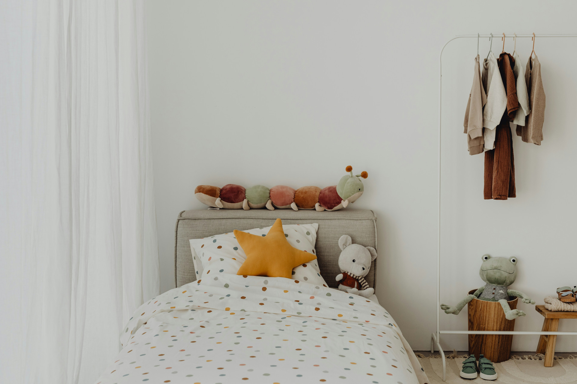 Farver påvirker stemningen i et rum. I et børneværelse, hvor der skal soves, er det en fordel at vælge rolige nuancer som støvet blå, grøn, beige eller grå. Undgå meget stærke farver på vægge og tekstiler omkring soveområdet – de kan virke stimulerende.
